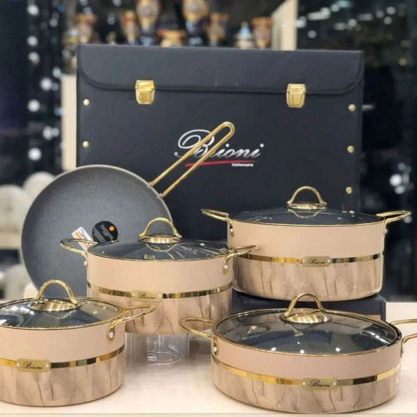 سرویس قابلمه ۹ پارچه بریونی اصل ترکیه با پوشش گریبلون المان که در مقابل خط و خش بسیار مقاوم و بسیار نچسب بادر شیشه ای نشکن در مقابل حرارت