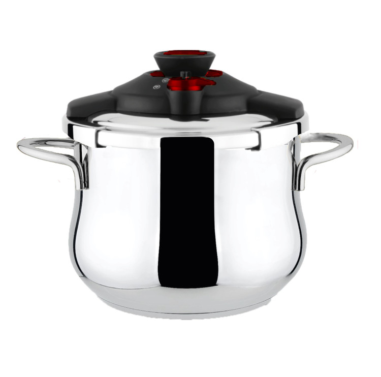 زودپز تک استیل خمره ای ۶ لیتر با کف چدن اصل ترکیه و سوپاپ اطمینان با پخت سریع و اسان بادرب کیلیپسو با نشان استاندارد اروپا مناسب تمام اجاق ها حتی اجاق های الترونیکی و القایی بجای دکمه های قرمز روی درب رنگ کرم موجوده که بسیار شیک و خاصتر شده
